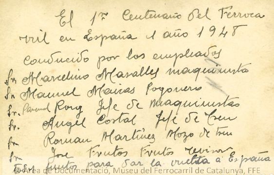 Ante ese tren especial construido para celebrar el centenario, remolcado por la locomotora ‘Mataró’ que se conserva en el Museu, se hicieron una foto los empleados ferroviarios que lo condujeron. Esa imagen forma parte de los materiales familiares depositados en el Museu por Xavier Costal, nieto de Àngel Costal, que fue jefe de tren en aquella efeméride. Y en el reverso de otra de las fotografías donadas, tras mencionar el centenario y la fecha, aparecen los nombres de los tripulantes que participaron en aquel viaje: