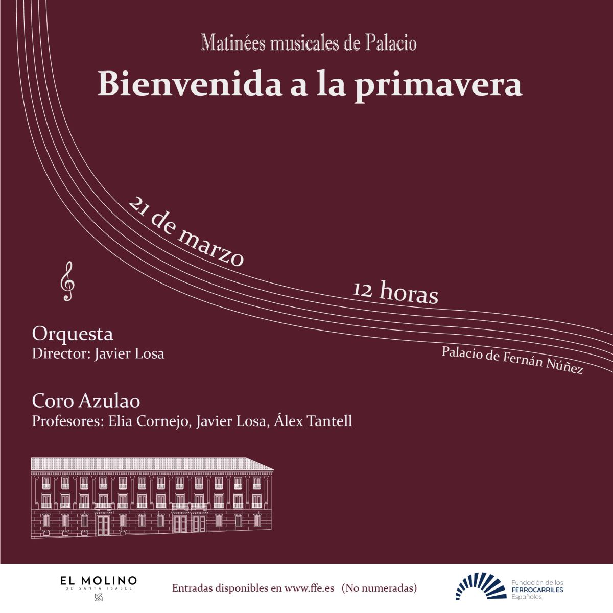 Ofrece tres conciertos en sus sedes madrileñas, coincidiendo con la llegada de la nueva estación, que son fruto de su colaboración con la escuela El Molino de Santa Isabel y la Escuela Municipal de Música Almudena Cano. El sábado 21 de marzo actuarán en el Palacio de Fernán Núñez la Gran Orquesta y el Coro Azulao de El Molino, y los días 23 y 25 se podrá escuchar en el Museo del Ferrocarril de Madrid a la Banda, el Coro de Adultos y el Combo de Música Moderna de la escuela Almudena Cano.