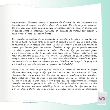 ilusionadas como ella por su primer viaje en tren. Al cabo de un rato empezó Clara bebió un trago de agua y vio levantarse una de las chicas. Le dijo a