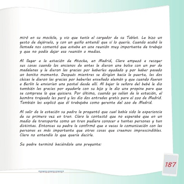 con ellos. Clara le contó que tenía un primo igualito y que hacía lo mismo Al salir de la estación su padre la preguntó que cual había sido la experiencia