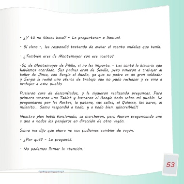 Comimos tranquilamente y nos volvimos a nuestros asientos del vagón cinco. habíamos acordado. Sus padres eran de Sevilla, pero vinieron a trabajar al