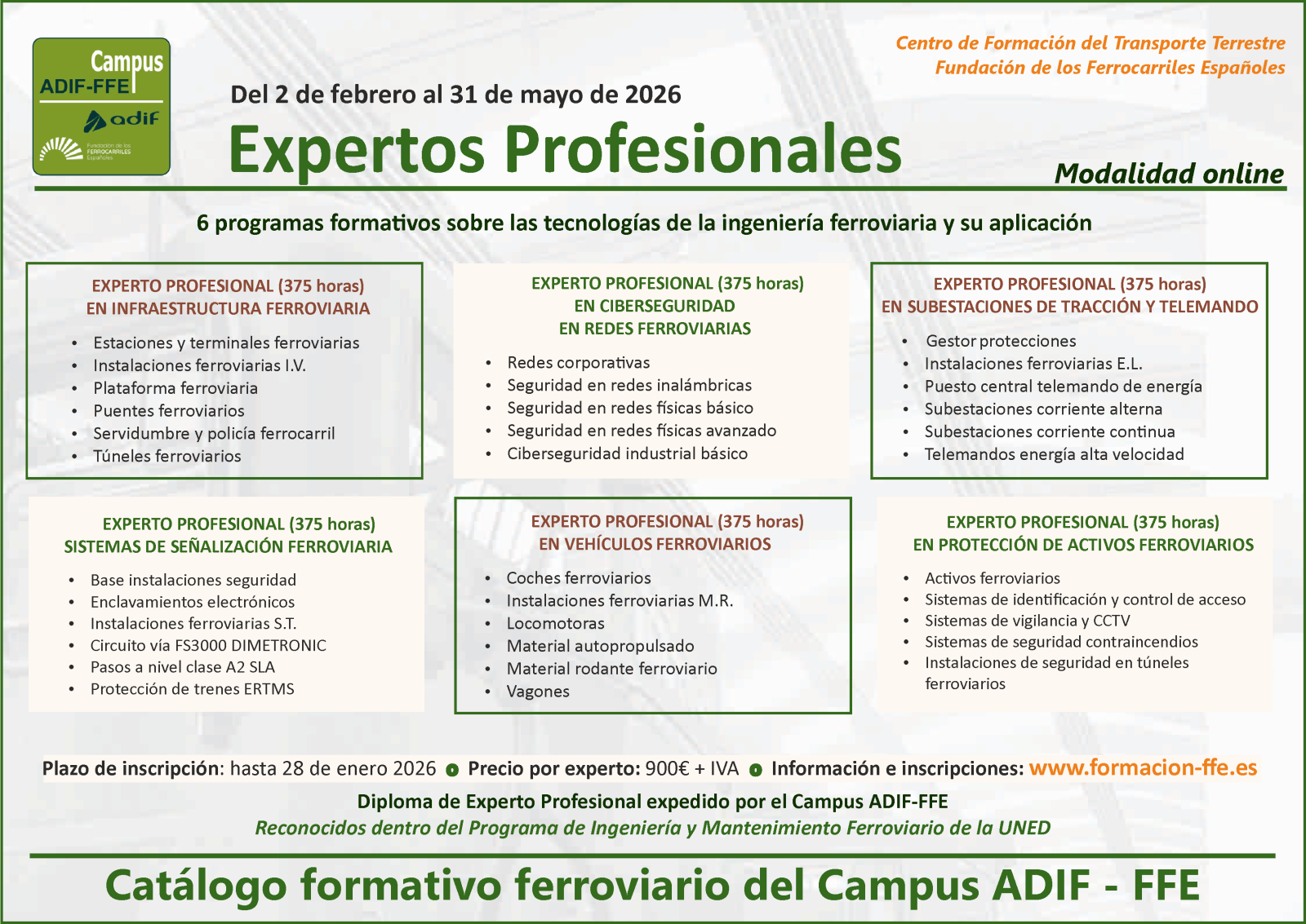 Seis programas Expertos Profesionales sobre las tecnologías de la ingeniería ferroviaria y su aplicación, que se enmarcan en el Campus ADIF-FFE, se imparten en modalidad online y están reconocidos dentro del Programa de Ingeniería y Mantenimiento Ferroviario de la UNED. El plazo para inscribirse está abierto hasta el 28 de enero.